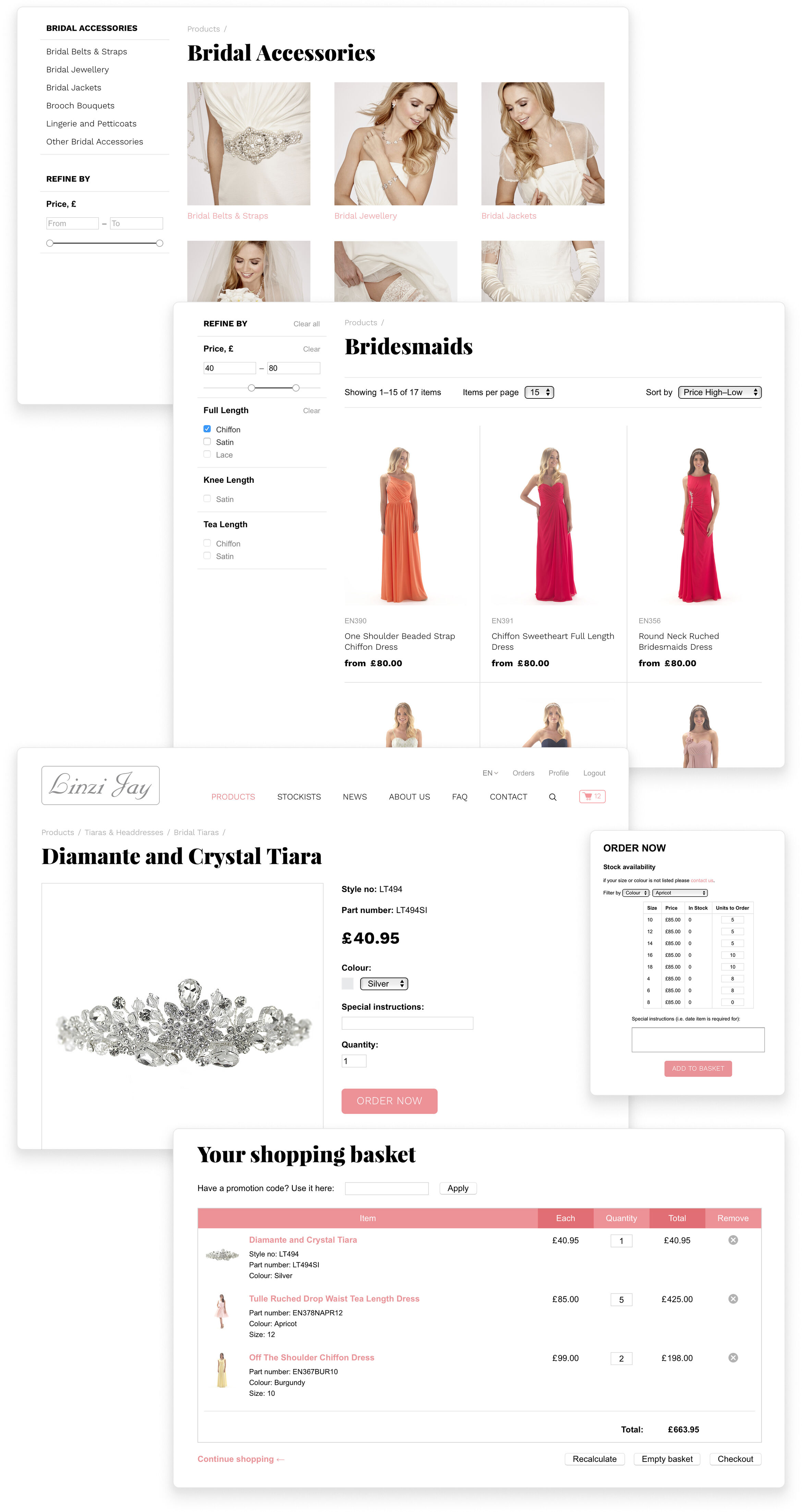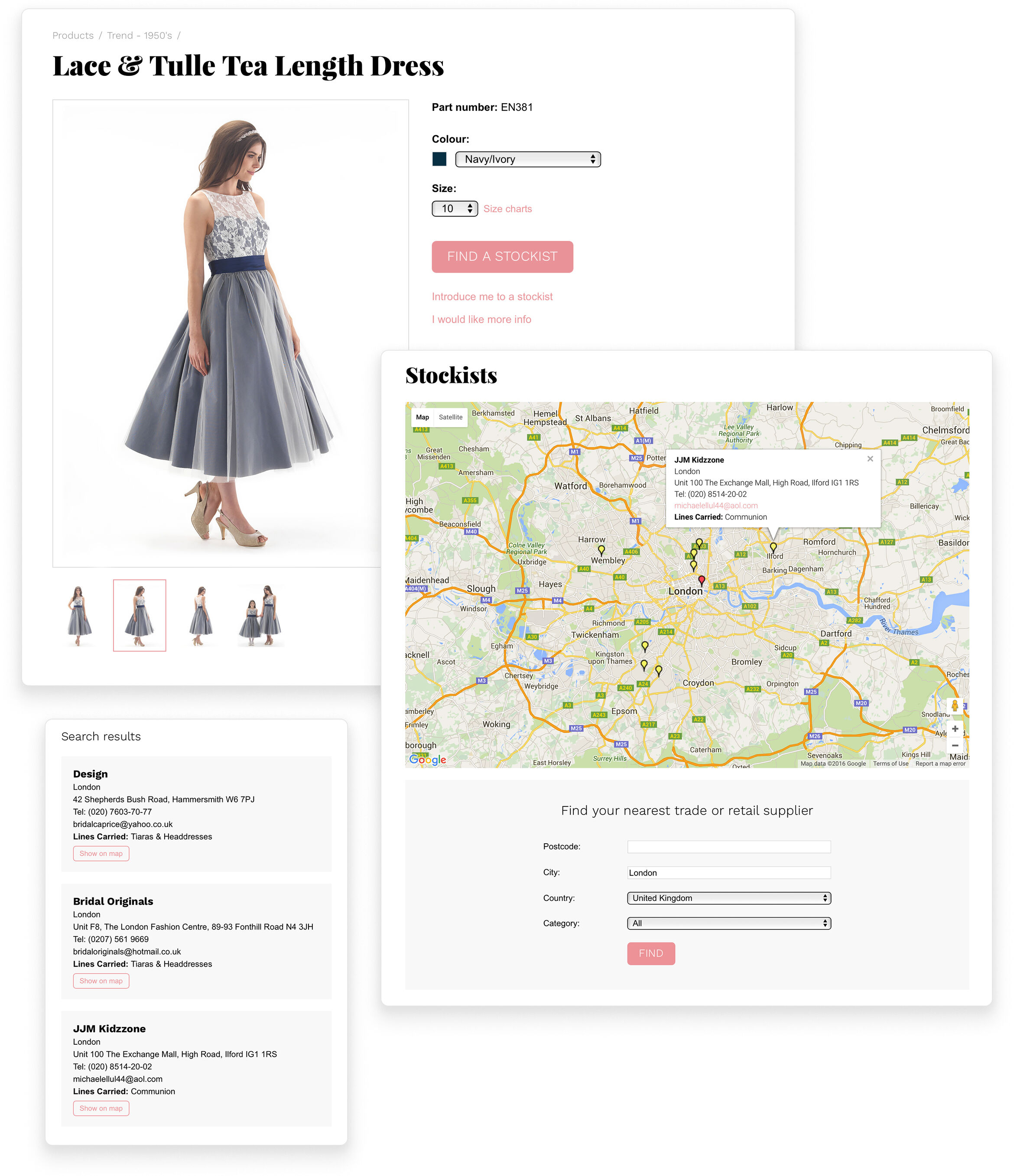 As Linzi Jay work with independent retailers in the UK and Europe all retail customers will need to make contact with nearest stockist and arrange to purchase the product from there. For these customers we integrated a simple "Find a Stockists" system. It helps to quickly find the nearest trade or retail supplier by location and product category.