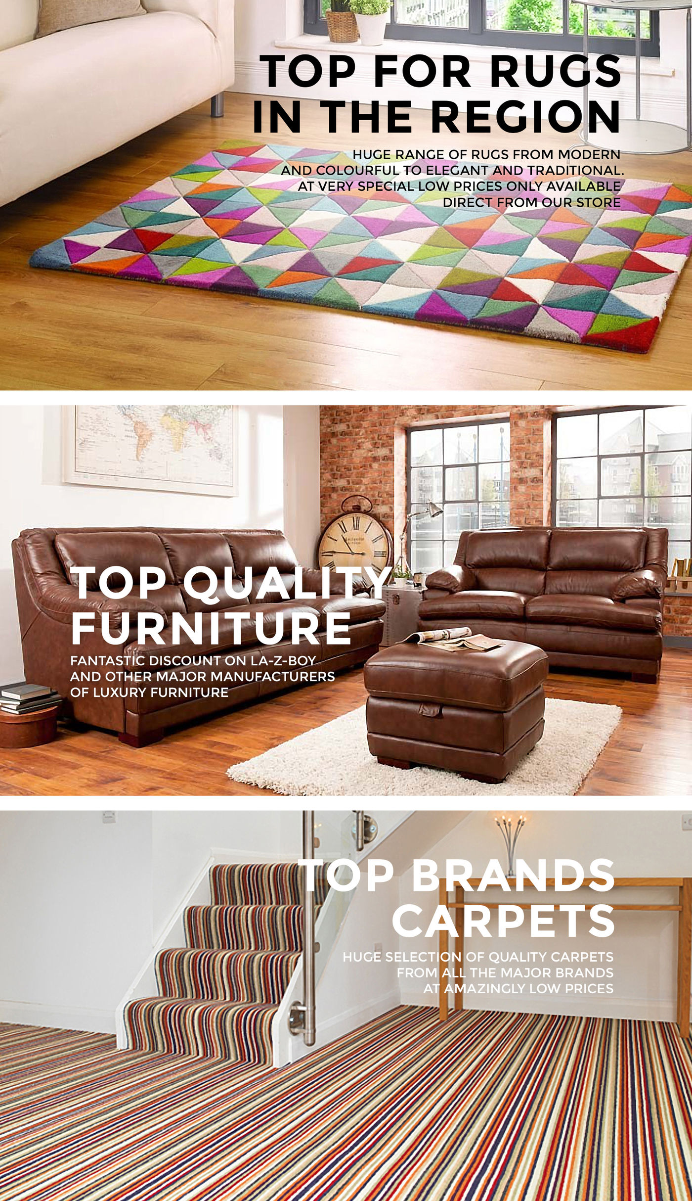 Fabulous large showroom displaying carpets. rugs, sofas, suites, armchairs, vinyl floor coverings, laminate flooring, beds, mattresses, tables.